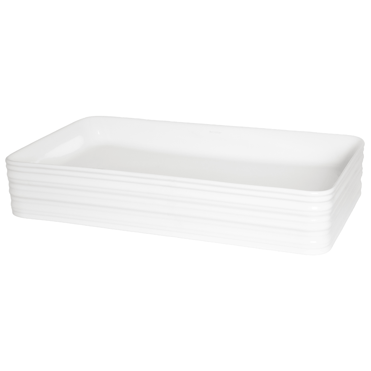 Rechteckiges Aufsatzwaschbecken aus Keramik, glänzend weiße Oberfläche mit gerillter Textur auf der Außenseite, die einen grafischen, modernen und sehr eleganten Akzent in Ihrem Badezimmer setzt.