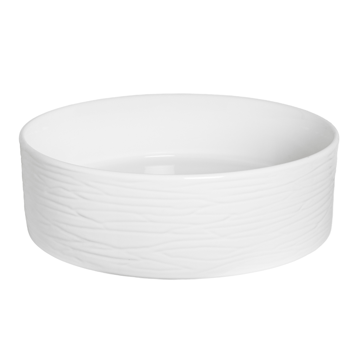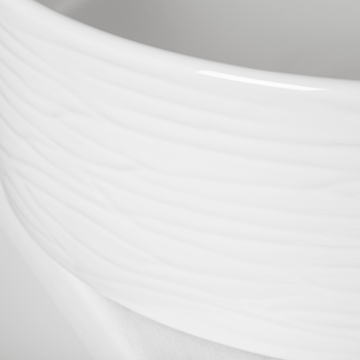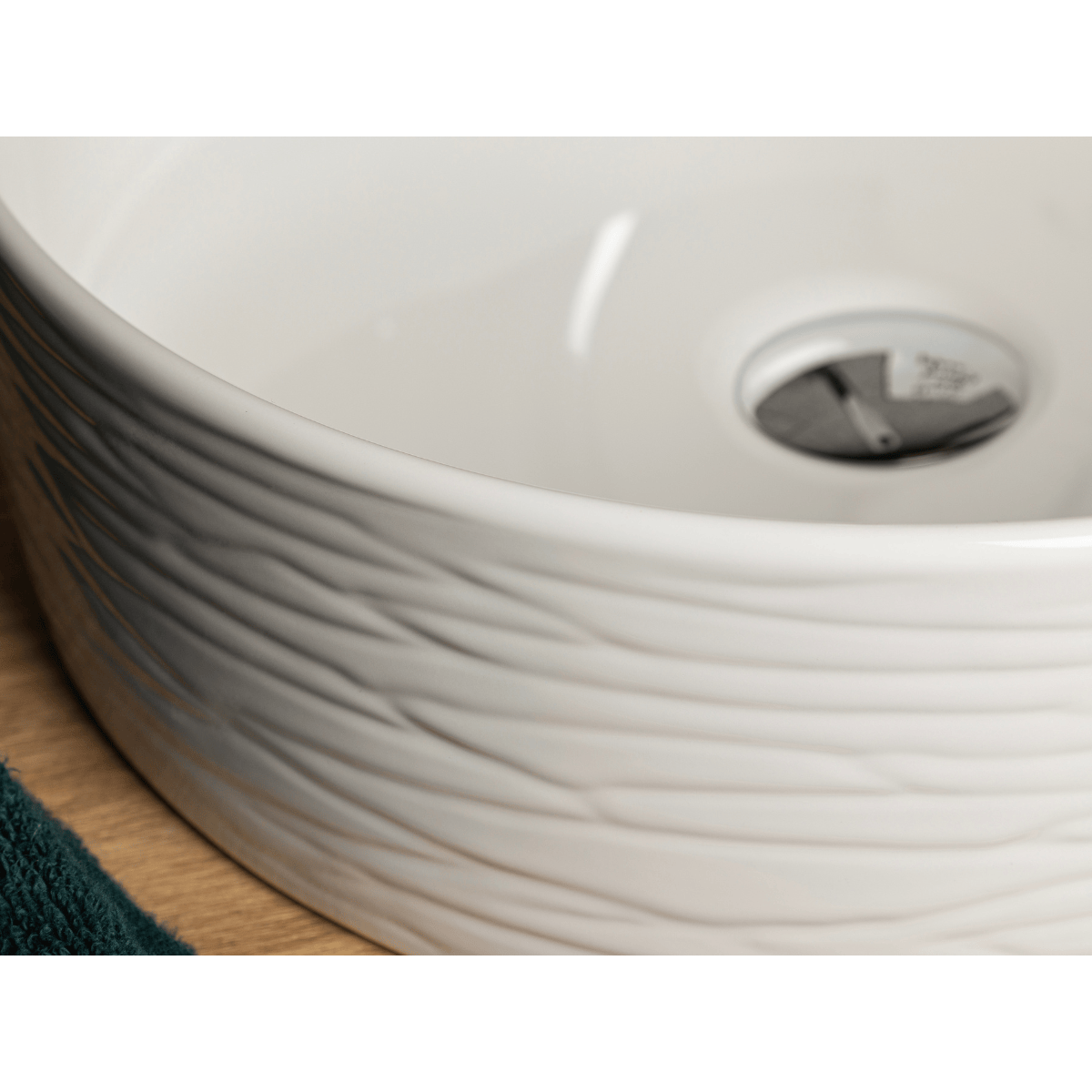 Rundes Aufsatzwaschbecken aus Keramik, glänzend weiße Oberfläche mit erhabenen Linien auf der Außenseite, die an die Textur natürlicher Blätter erinnern. Diese eleganten Wellen verleihen dem Waschbecken Modernität und Sanftheit.