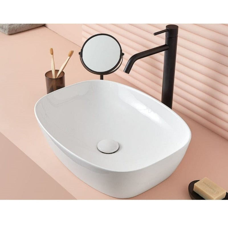 Aufsatzwaschbecken BALTA, rechteckiges Design aus glänzender weißer Keramik. Elegant und funktional – ideal für moderne Badezimmer. Leicht zu reinigen, flecken- und kratzfest