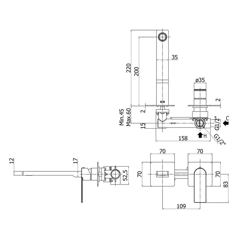 PIANURA Giulia Waschtisch-Wandarmatur 20 cm inkl. Grundkörper, wassersparend