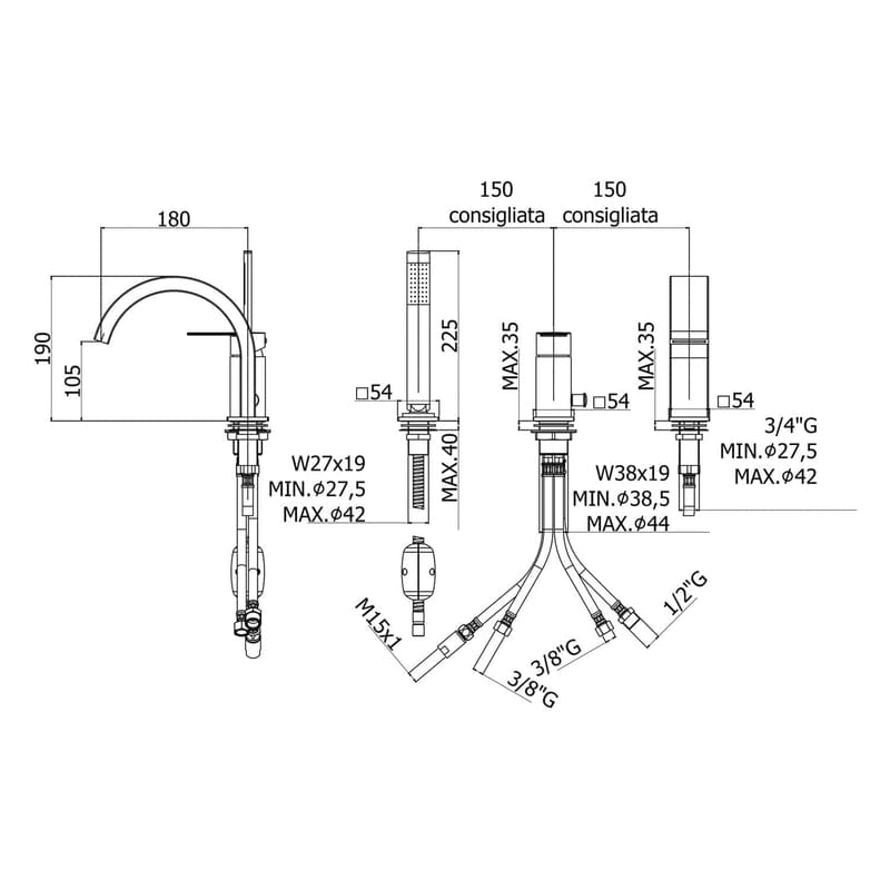 PIANURA Giulia Dreiloch-Wannenrand-Einhebelmischer inkl. Brausegarnitur