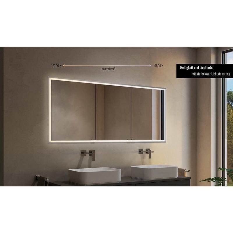 Der KRONENBACH Cube 2.0 Spiegelschrank (140 cm, Unterputz, 3-türig) kombiniert modernes Design mit hoher Funktionalität. Er bietet stufenlos dimmbare LED-Beleuchtung, Touch-Steuerung, verspiegelte Rückwand und sechs Glasablagen. Drei Steckdosen und ein eleganter Aluminium-Korpus ergänzen das hochwertige Gesamtbild. Erhältlich in silber eloxiert und schwarz seidenmatt