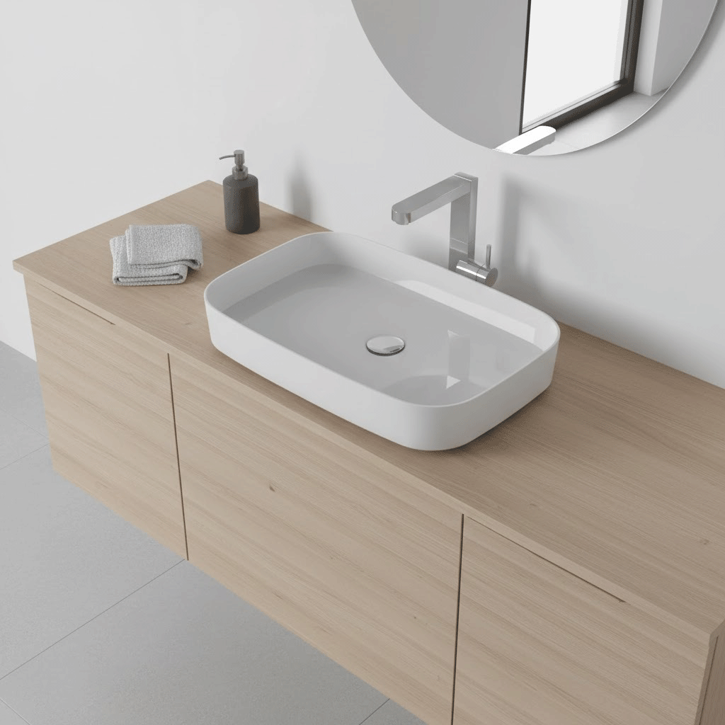 Aufsatzwaschbecken aus Gussmarmor der Marke STANO. Dieses Material zeichnet sich durch seine hohe Widerstandfähigkeit aus. Sein Seidenglanz verleiht ihm eine bemerkenswerte Eleganz. Modernes, minimalistisches Design.