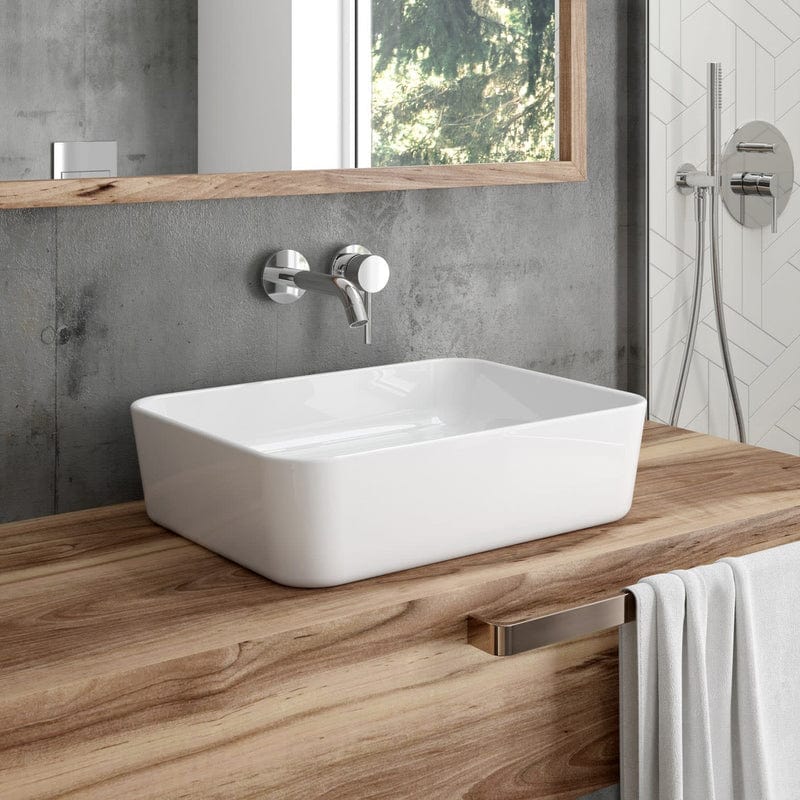 OLTENS Forde Aufsatzwaschbecken rechthoekig overtuigt met strakke lijnen en moderne esthetiek. Hoogwaardige keramiek, gemakkelijk schoon te maken en perfect voor stijlvolle badkamerinrichting – een elegante keuze voor eigentijdse badkamers