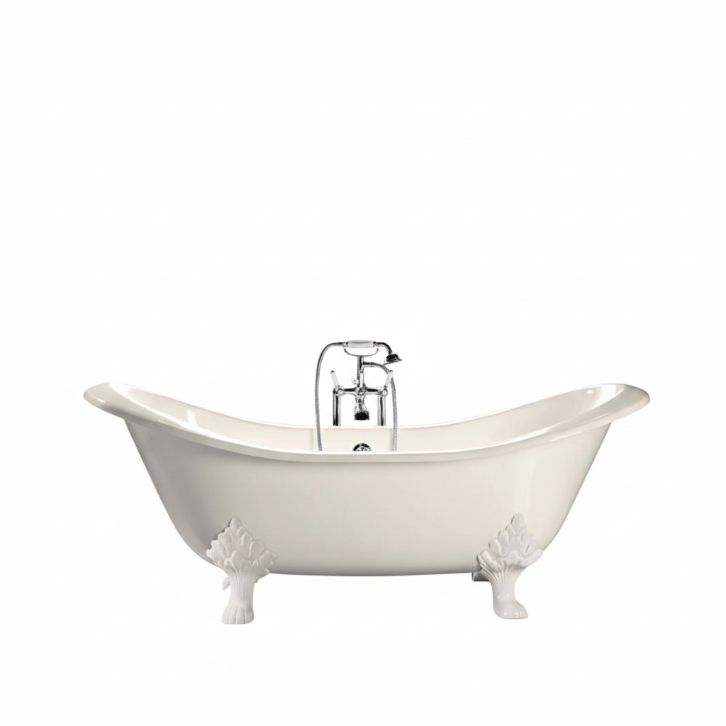 Gietijzeren bad KINGSTON wit van Rogier&Mothes met voeten. Van binnen geëmailleerd en van buiten handgeschilderd. Voor optimaal comfort, van twee personen biedt dit model een dubbele rugleuning. Een bad, geïnspireerd door vervlogen tijden.