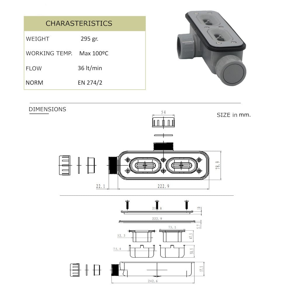 • Dikte bij de afvoer: 1 cm (tolerantie ±1 mm)