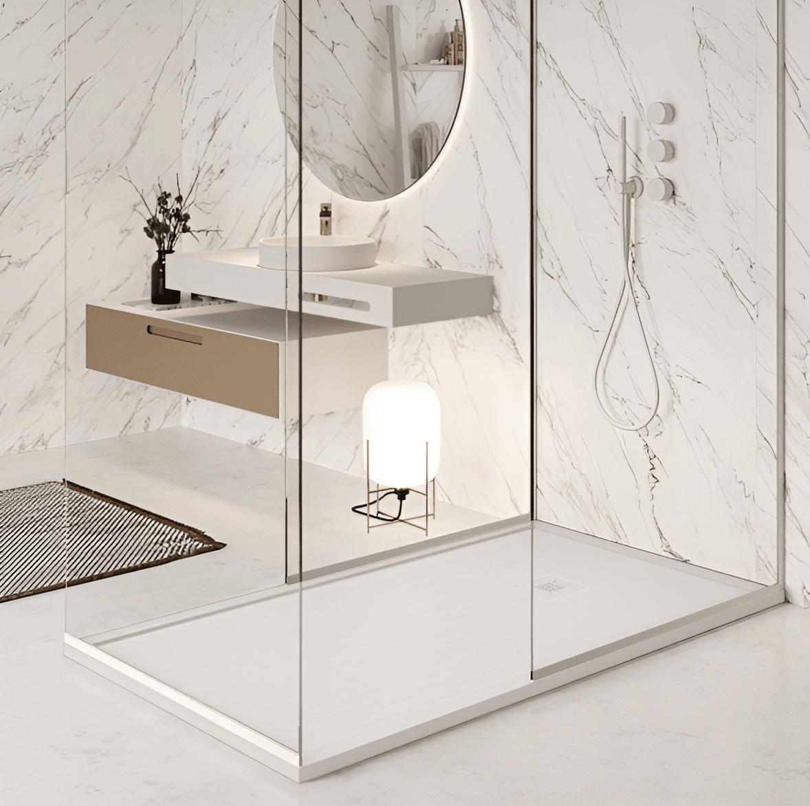 Duschwannen mit Struktur aus Mineralguss sind ideal für ultramoderne Duschen und die beste Alternative zu Acryl-Duschwannen.