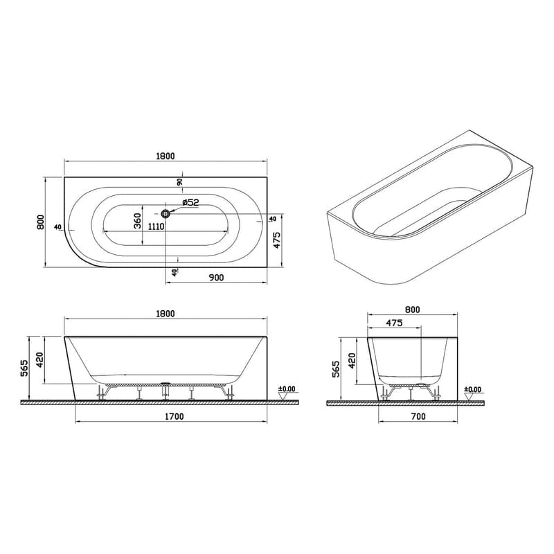 pianura Valentina Eckbadewanne 180 x 80 cm mit Ecke rechts