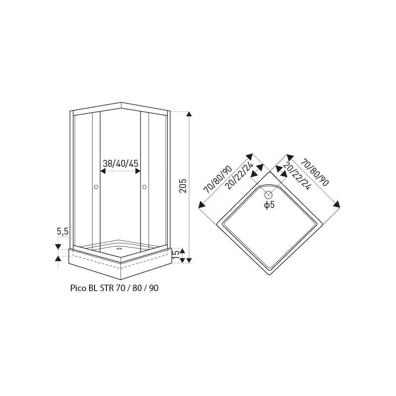 • Duschwannengröße: 70 x 70 x 15 cm, 80 x 80 x 15 cm, 90 x 90 x 15 cm