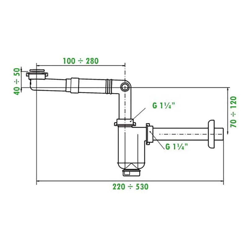 • Der gesamte Siphon kann von 22 cm bis 53 cm verstellt werden