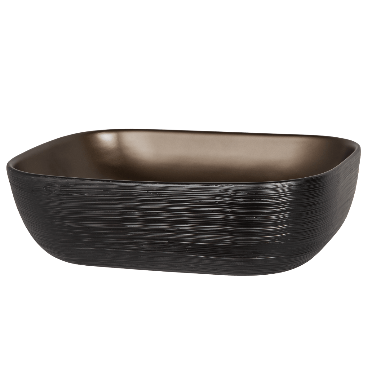 Rechteckiges Aufsatzwaschbecken aus Keramik, Oberfläche in braun und schwarz mit gerillter Struktur, das Ihrem Badezimmer eine besonders designorientierte Note und verleiht dem Waschbecken ein modernes, strukturiertes erscheinen.