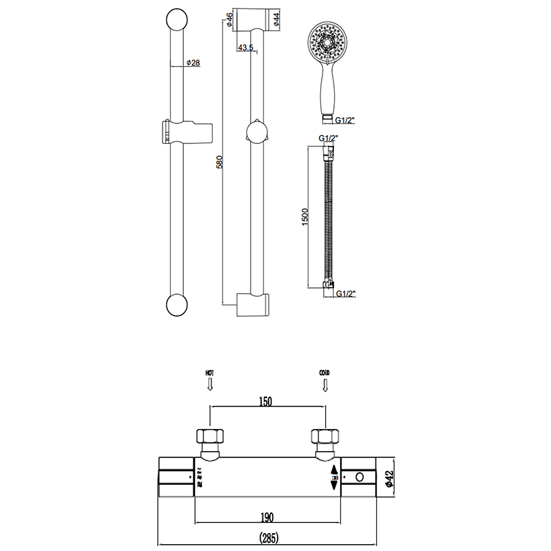 - Thermostatischer Wandduscharmatur mit Keramikkartusche. Anti-Verbrüh-System (Sicherheitsstopp bei 38°C) und Rückschlagventil der Schweizer Marke NEOPERL®.